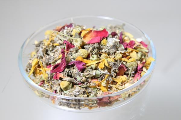優しいバラの香りと、ラズベリーリーフからほんのり香るフランボワーズ、カモミールのリンゴの風味が、溶け合って、PMSや更年期などのイライラを鎮めてリラックスを促します。